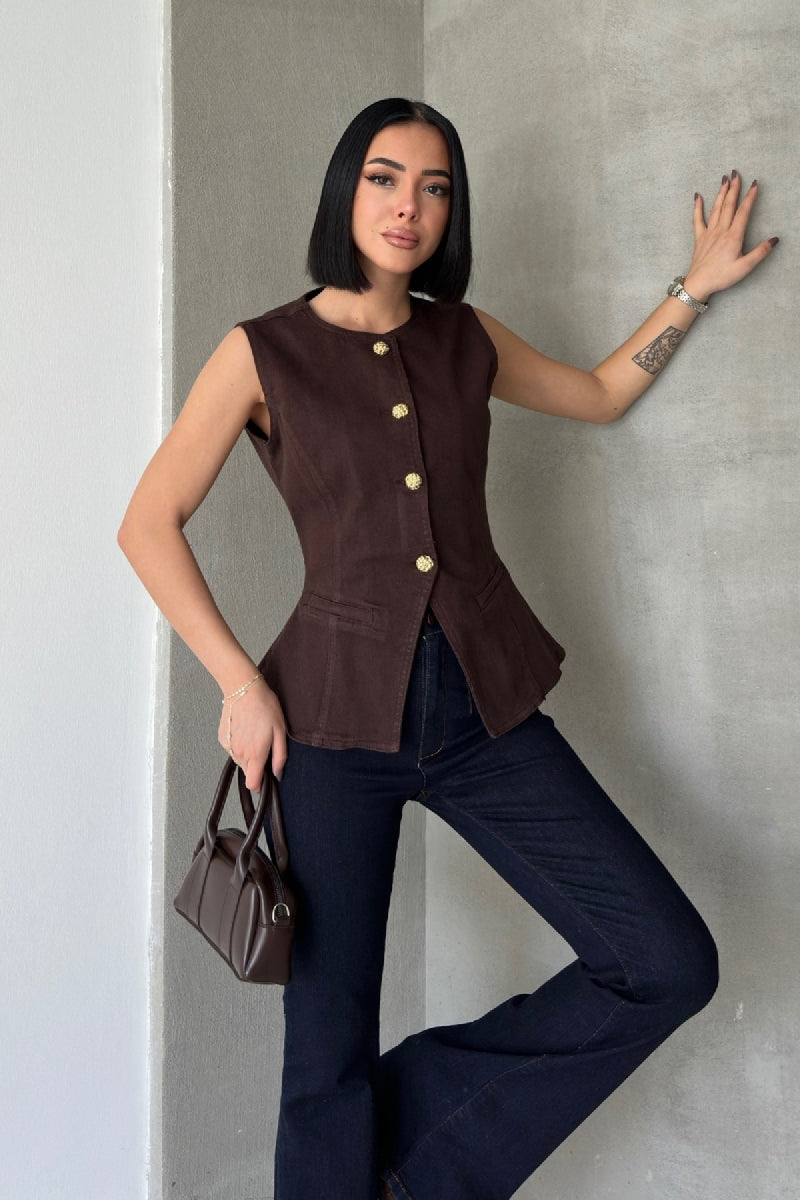 Belden Oturtmalı Düğmeli Kot Yelek 6086
