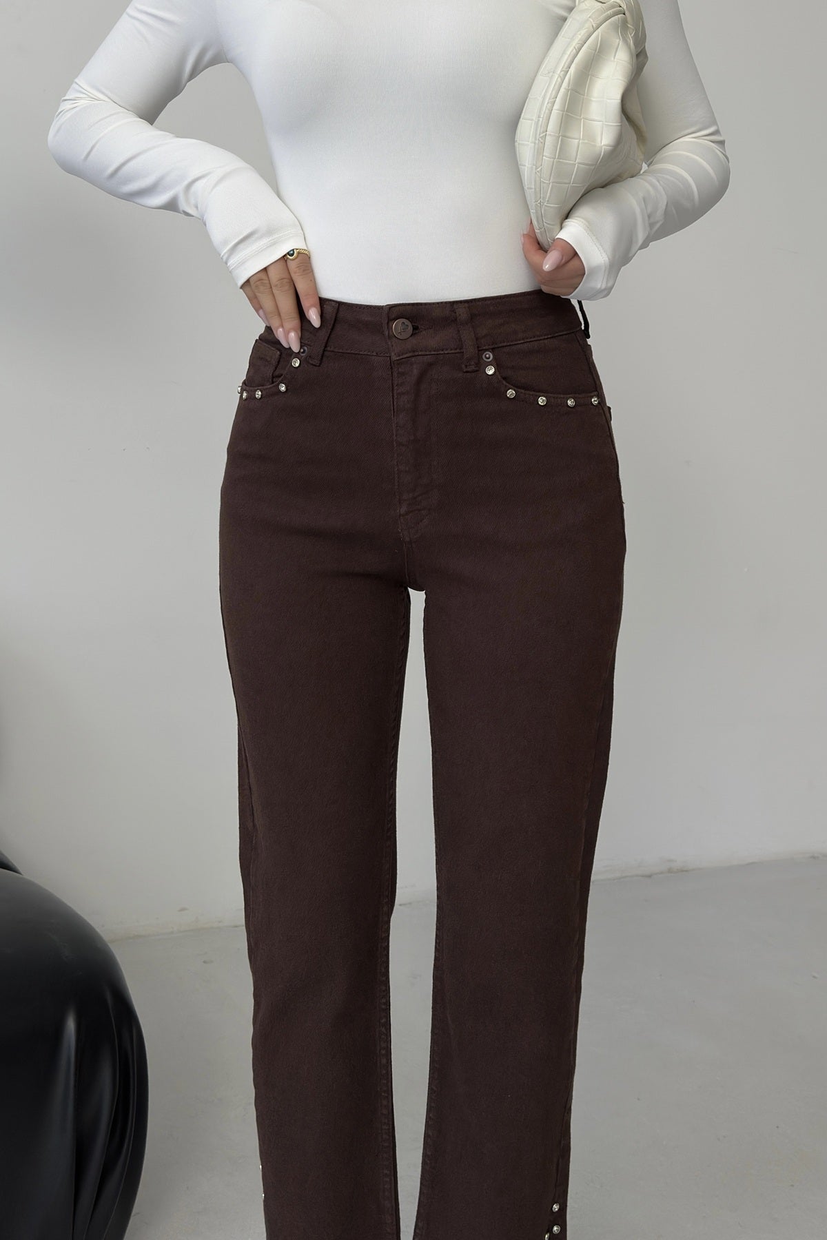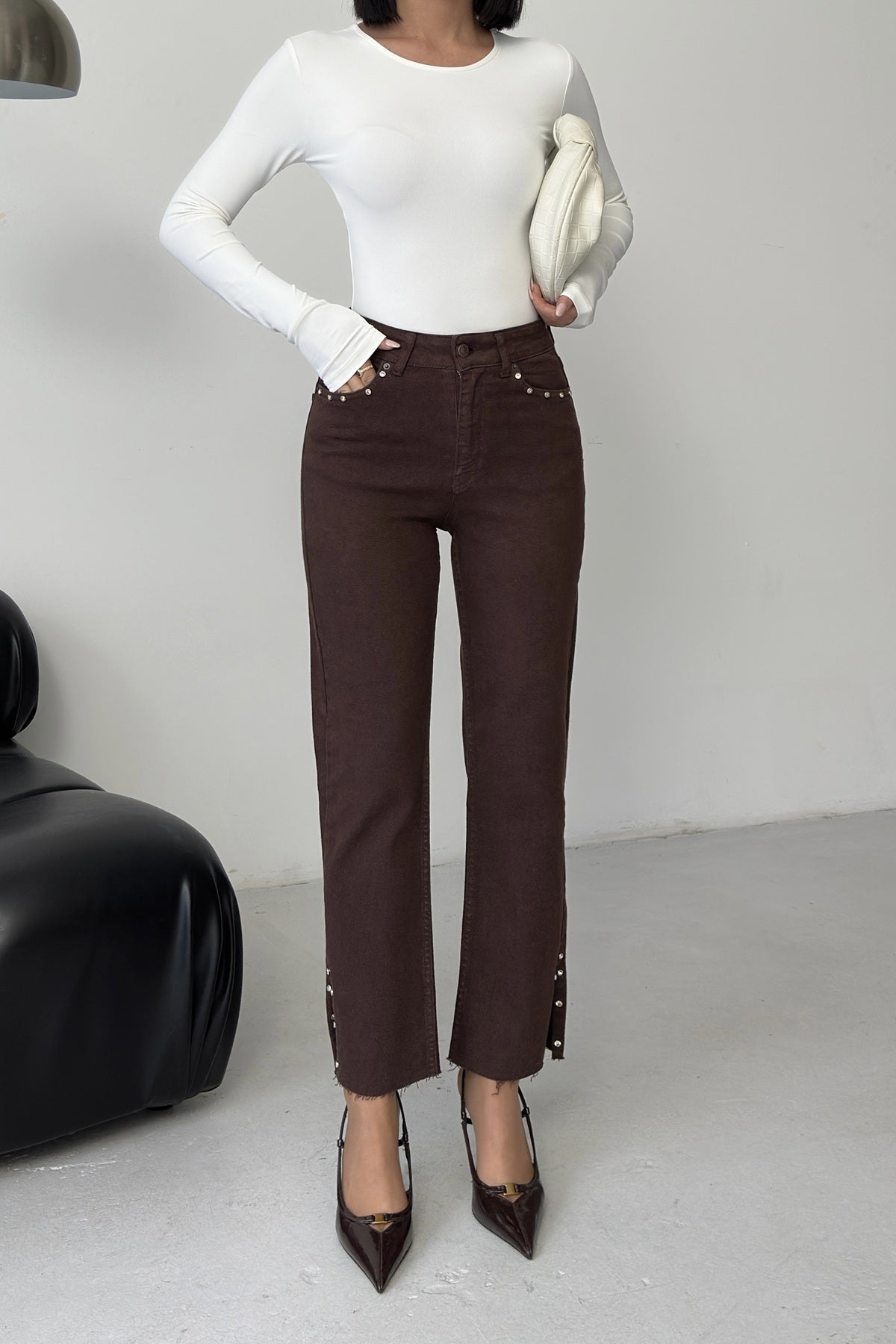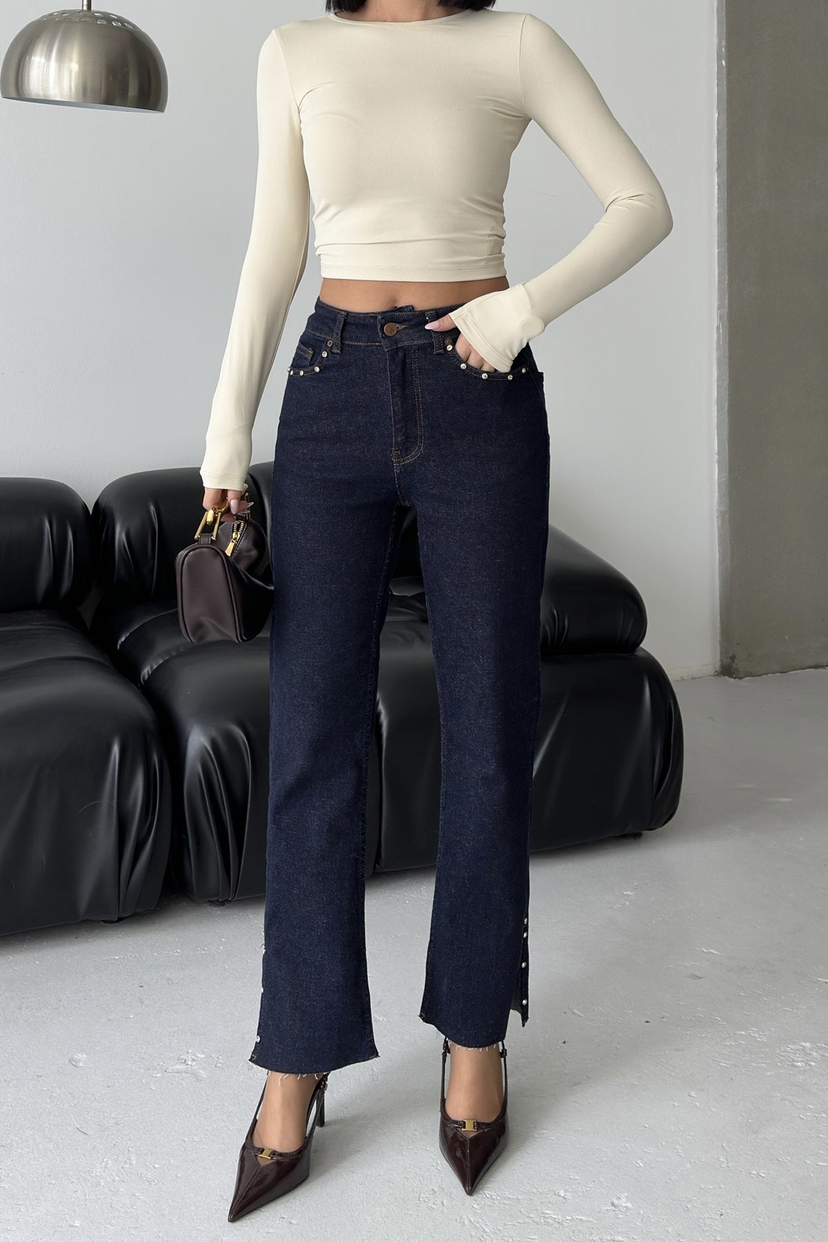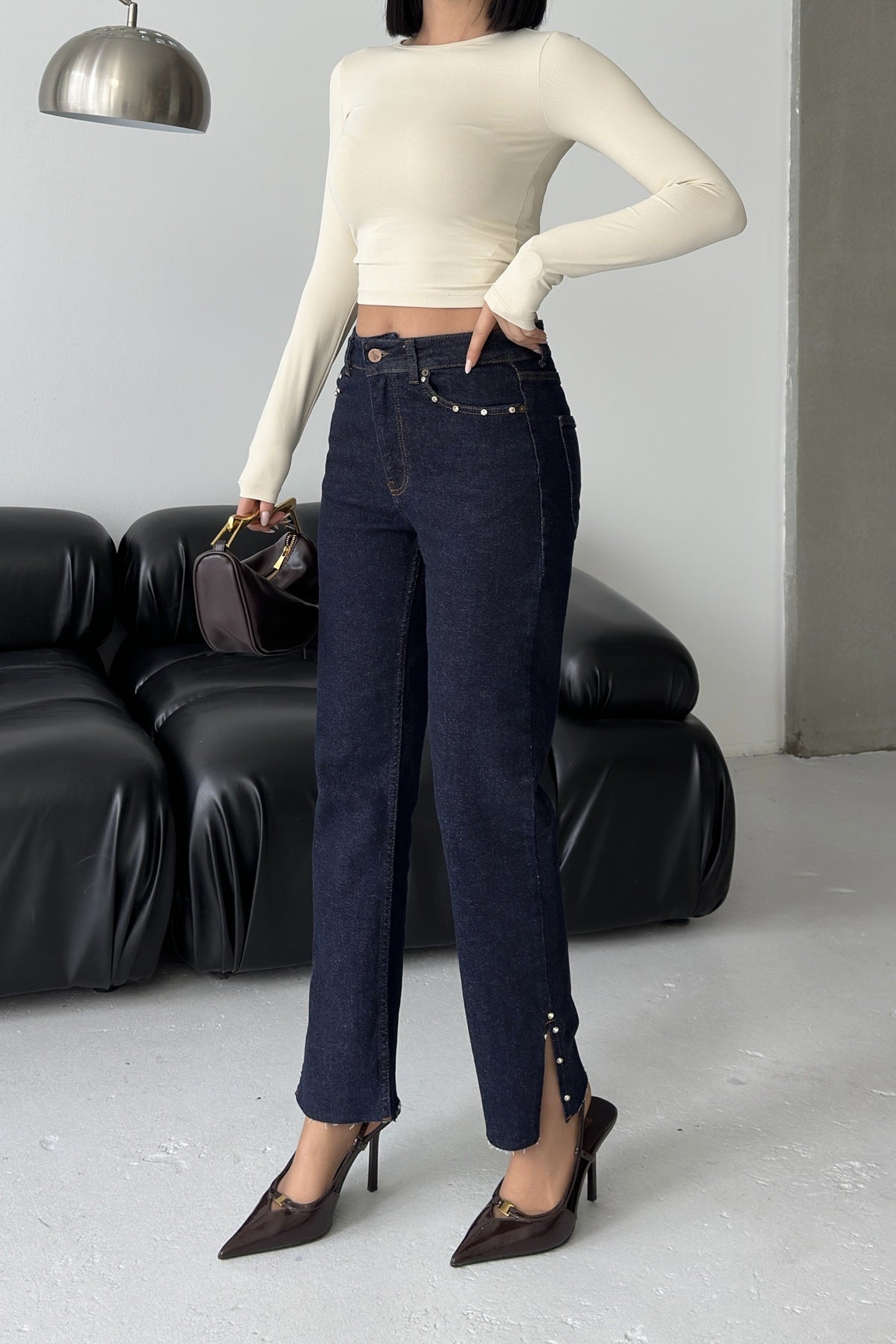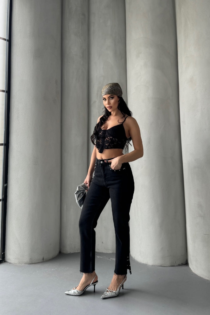 Yanı Yırtmaçlı Flare Paça Mom Kot Pantolon 1774